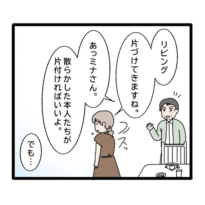 義父の朝食の準備を終えた私が「リビング片付けてきますね」と言ってリビングに向かおうとすると、義父がすかさず「あっミナさん。散らかした本人たちが片付ければいいよ」と言ってくれました。私が「でも・・」と戸惑っていると、