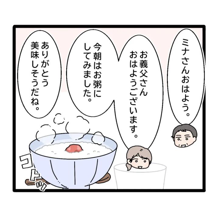 しばらくすると、義父が「ミナさんおはよう」と起きてきました。最近体調があまり良くなさそうだった義父にお粥を出すと「ありがとう。美味しそうだね」と喜んでくれました。