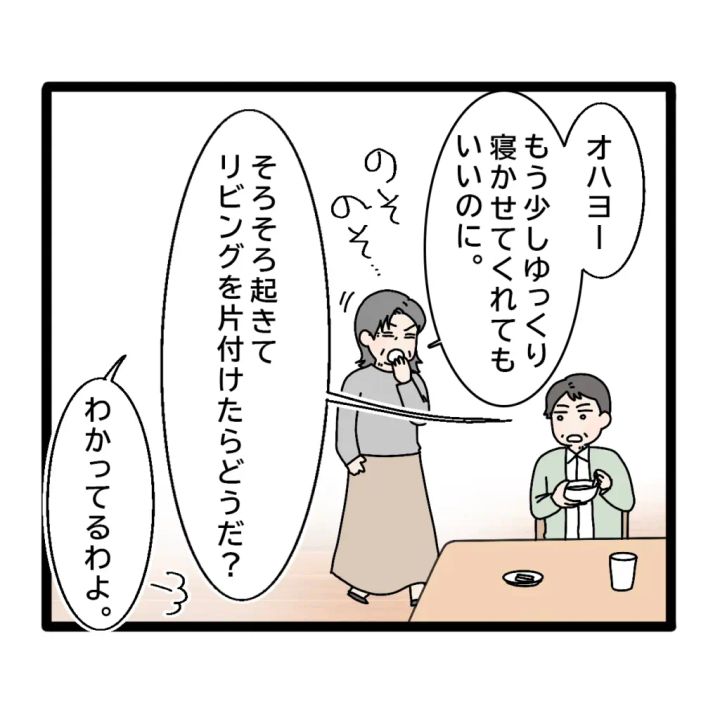 ちょうど「オハヨー。もう少しゆっくり寝かせてくれてもいいのに」と言いながら眠そうに義母が起きてきました。あくびをする義母に義父が「そろそろ起きてリビングを片付けたらどうだ?」と言うと、「わかってるわよ」と面倒くさそうに義母が答えました。