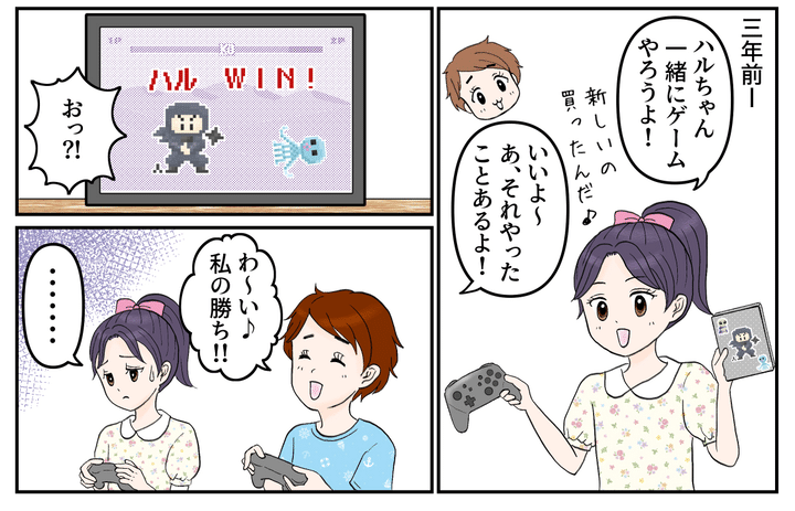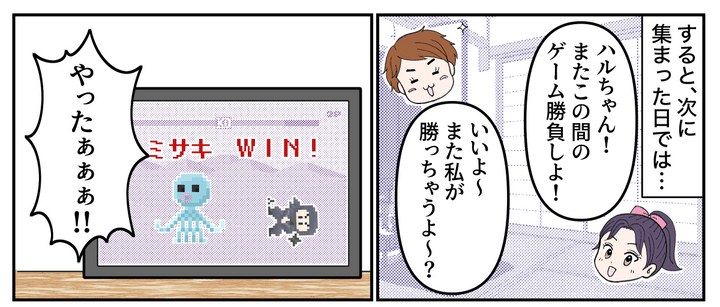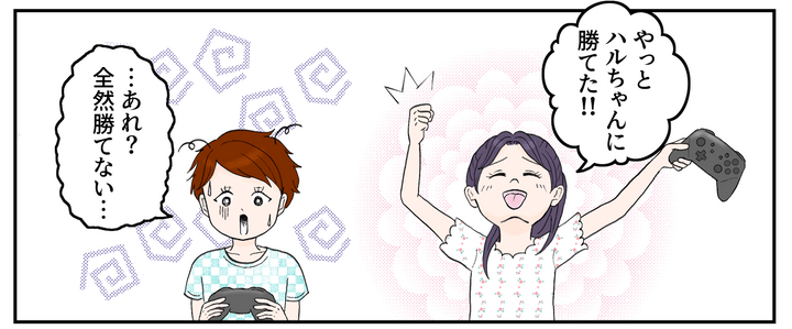 あれはまだハルが低学年の頃。新しく買ったゲームで、ミサキちゃんはまったくハルに勝てませんでした。すると次に行ったときには驚くほど強くなっていたのです。なんでもハルに勝つために、特訓していたのだとか……。
