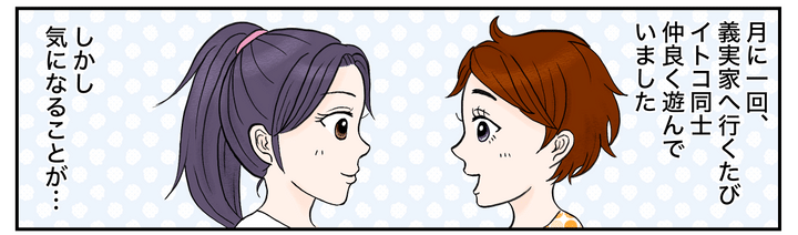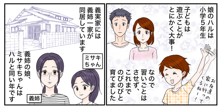 私はナツ。夫のアラタと小学5年生の娘ハルと暮らしています。子どものうちは遊びを優先してのびのび育ってほしいと思い、ハルにはこれまで習い事もさせてきませんでした。義実家で同居している義姉夫婦の娘ミサキちゃんは、ハルと同じ小学5年生。たまに義実家を訪れるとイトコ同士で遊んでいます。しかし義姉の教育方針にはモヤモヤさせられる場面も……。私から見ると完璧主義の義姉が、ミサキちゃんに無理を強いているように思うのです。