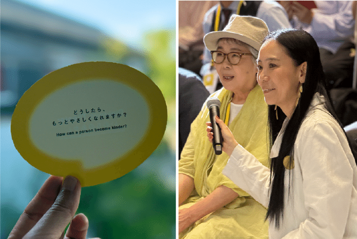 パビリオンの入り口でふきだしをかたどった小さなカードを受け取り、2階のホワイエヘ。カードに書かれていたのは「どうしたら、もっとやさしくなれますか? How can a person become kinder?」。