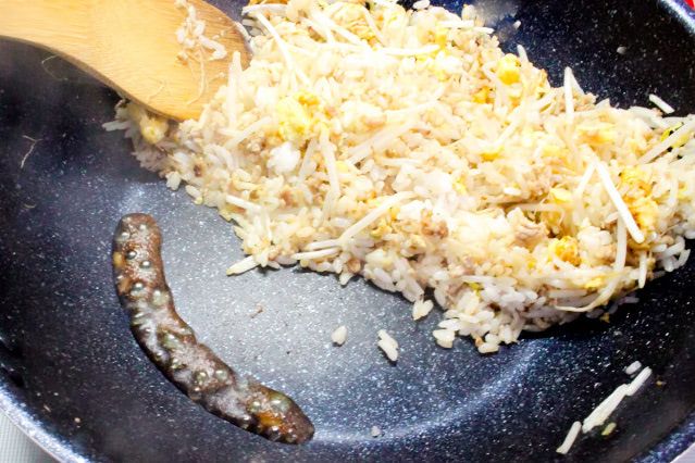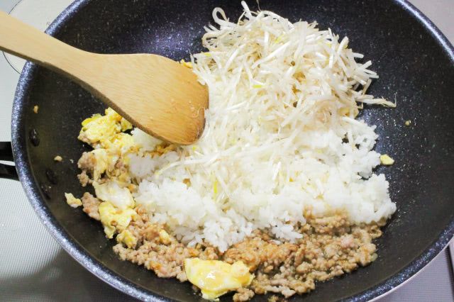 ご飯を加え、木べらで軽くほぐしてから、もやしを投入。もやしを加えてからは、それほど火を通さなくていいとのことですが、ご飯がある程度パラパラになるよう、2分ほど炒めました。
