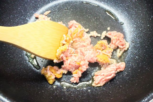 動画では強火で炒めていましたが、今回はフッ素樹脂加工のフライパンを使ったので、強めの中火で炒めました。みそは焦げやすいので豚肉の上に乗せ、混ぜ合わせていきます。1分30秒ほど炒めると、豚肉の色が変わって、香ばしいみその香りが広がりました。