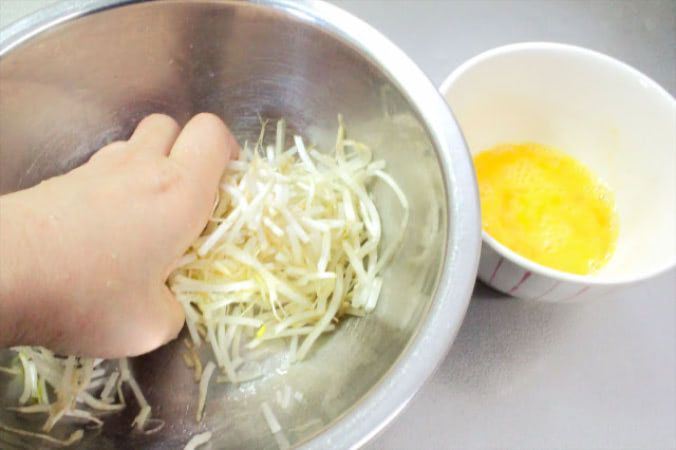 1. ボウルにもやしを入れて、手で折って細かくします。卵は、溶きほぐしておきます。