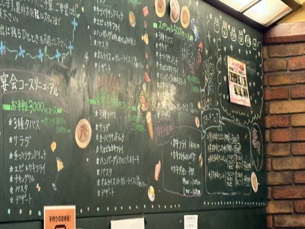 大きな広い黒板に目がとまる。ソファ席テーブル席もいっぱいある。