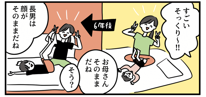 続いては娘がカメラマンとなり、私と長男の6年前の写真を再現する指示を出してくれました。途中夫も入っていろいろと調整しつつ、撮れた写真はこちら。6年経っても大人の私はほぼ変わらず…長男はすごく背が伸びているものの顔はそのままでした。6年経っても顔は変わらないんだ…!