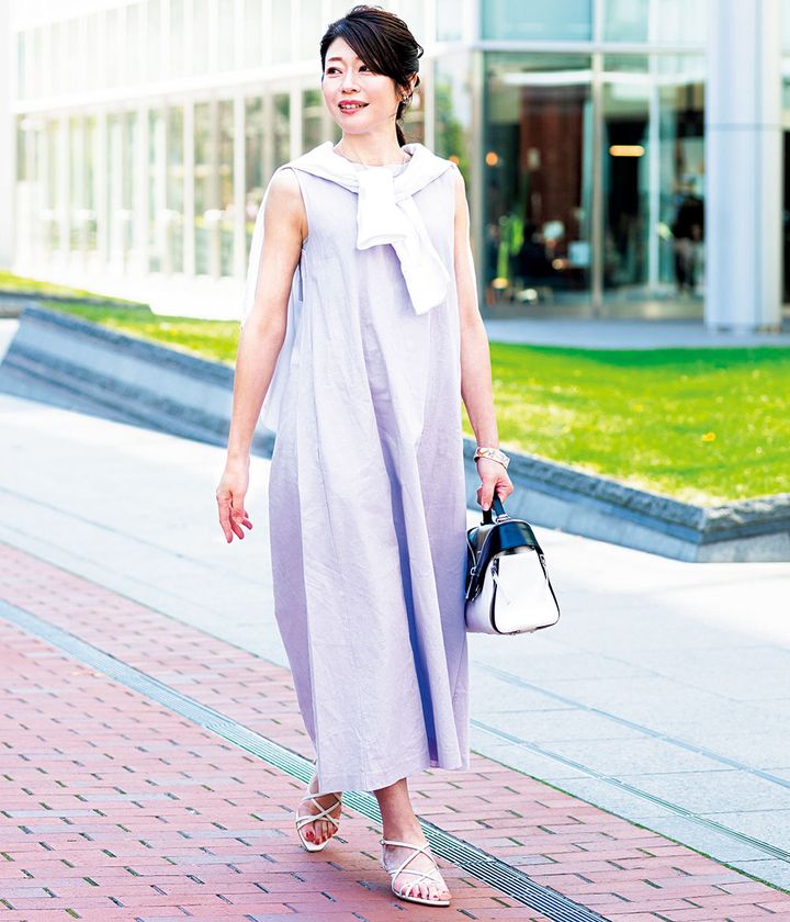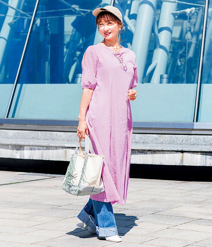 ラベンダー香る季節のお出かけは、きれい色のワンピースにカジュアルなアイテムを合わせてアクティブ感を出すのがブームです。