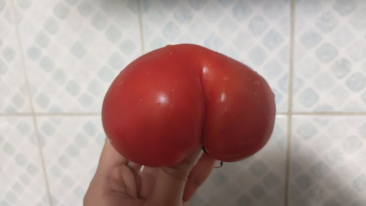 これはもう、完全にお尻!しかもツヤツヤしていて、きれいな形をしていますよね。トマトを食べようとして袋から出してこの形だった……と想像するだけで、思わず吹き出してしまいました。