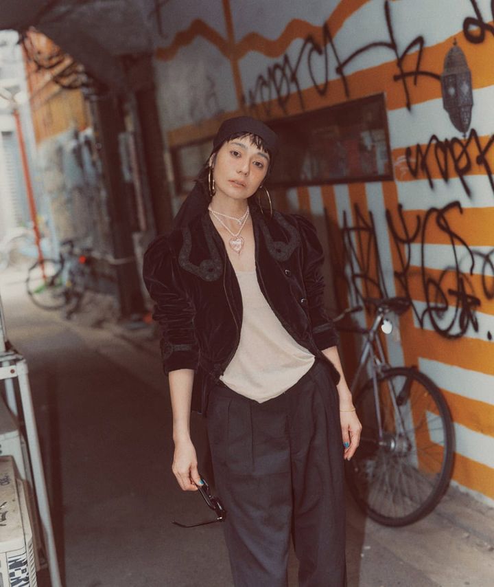 TOROのジャケット、forte_forteのキャミソール、anyteeのパンツ、FUMIKA_UCHIDAのヘッドアクセ、MARYAM NASSIR ZADEHのネックレス、H&Mのピアス/全て本人私物