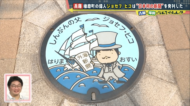 果たして、道谷先生の評価は……「100点満点で、怒濤の10点」! じつは道谷先生が手がかりだと話した丸いものとは、モニュメントでもアーチでもなく、駅前のマンホールだった。派手な色をしたそのマンホールには、「しんぶんの父 ジョセフ・ヒコ」の文字が。そう、ヒコは1864年、自らが見聞きした欧米の事情をまとめた「海外新聞」を発刊。これが“日本初の新聞”と言われているそうだ。