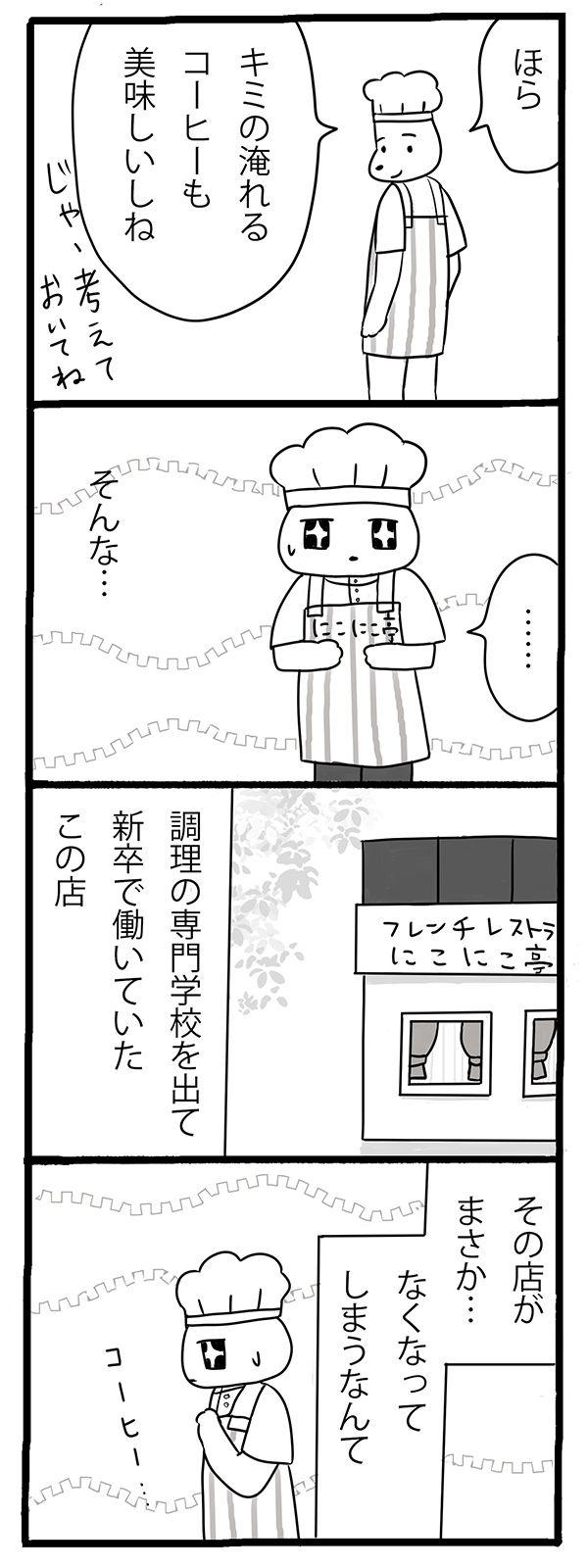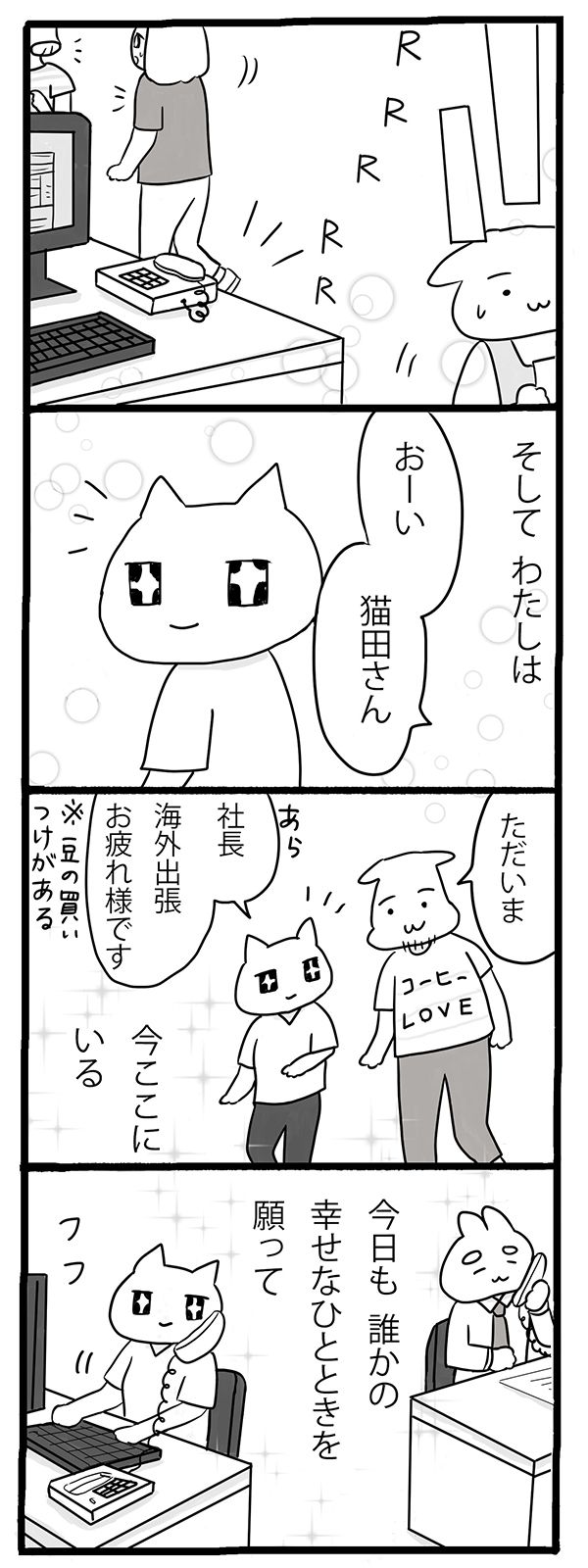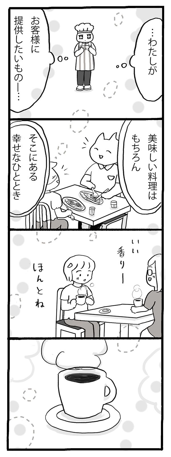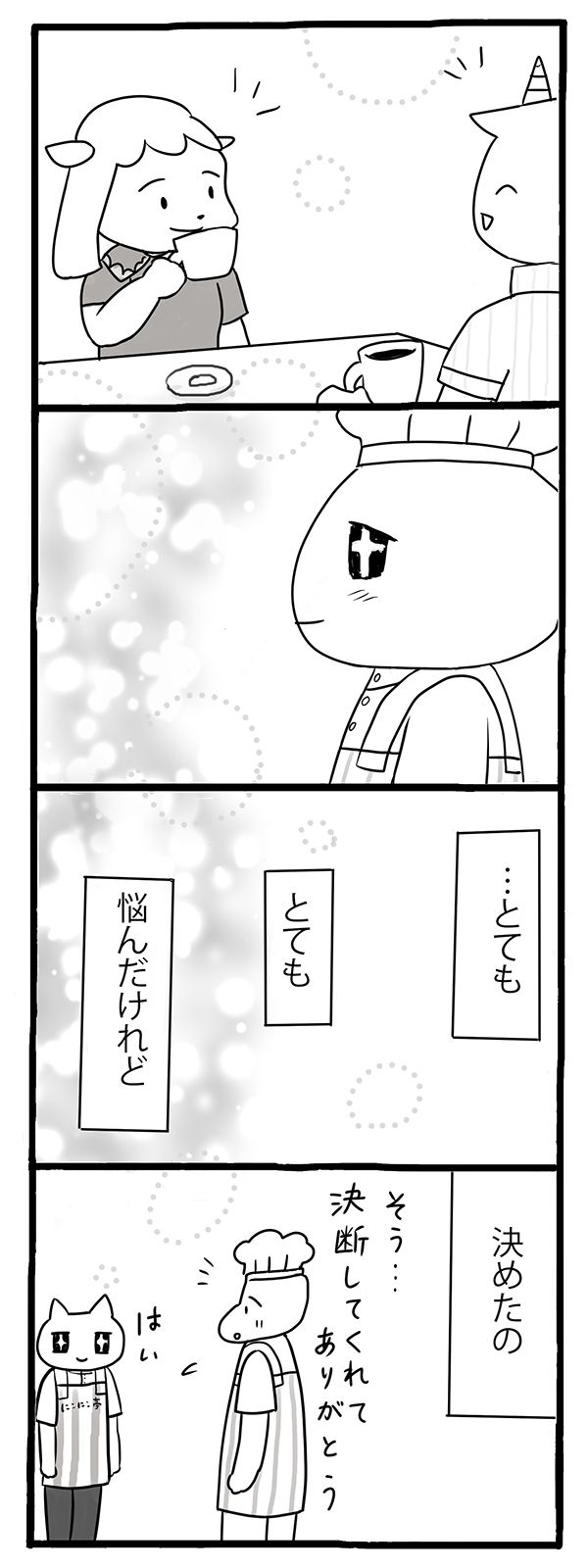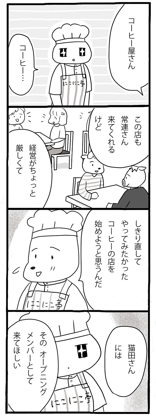 仕事と家族の間で迷いながら、自分のやりたいことを探っていく、イヌミヤさんの物語。お話は完結しましたが、番外編をお届けしています。今回ははらっぱコーヒーの上司・猫田さんのお話です。