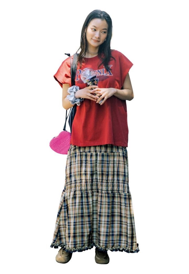 夏の着こなしに映えるポジティブカラーのチェック柄。さらっとした素材でロング丈も涼しげ。スカート¥7,700(ローリーズファーム/アダストリア)