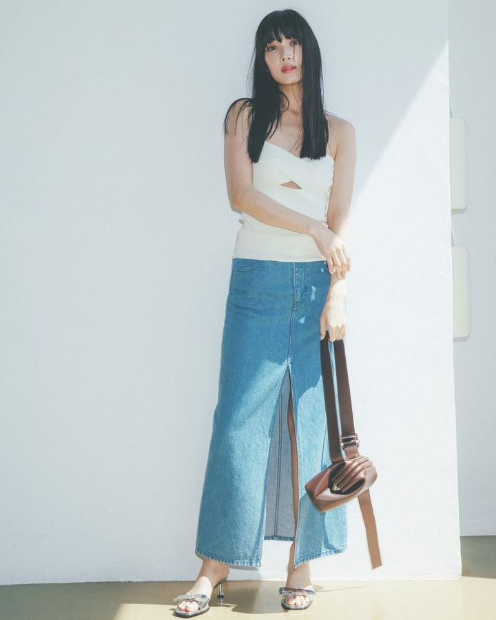 肌見せの分量が絶妙なベアトップは、女っぽさとヘルシーさのバランスが鍵。デニムスカートでカジュアルダウンすれば、抜け感たっぷりの旬コーデが完成します。小物はダークトーンで引き締めて、メリハリのある大人スタイルに仕上げて。