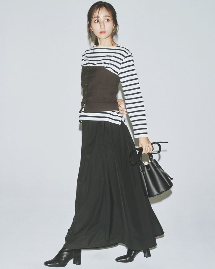 カジュアルなボーダートップスに、ビスチェを重ねてメリハリのあるスタイルに。黒のフレアスカート&ショートブーツで、大人っぽさとモード感をひとさじ。バッグもシックにまとめて、洗練された“フレンチカジュアル”に仕上げて。