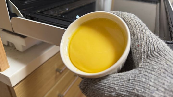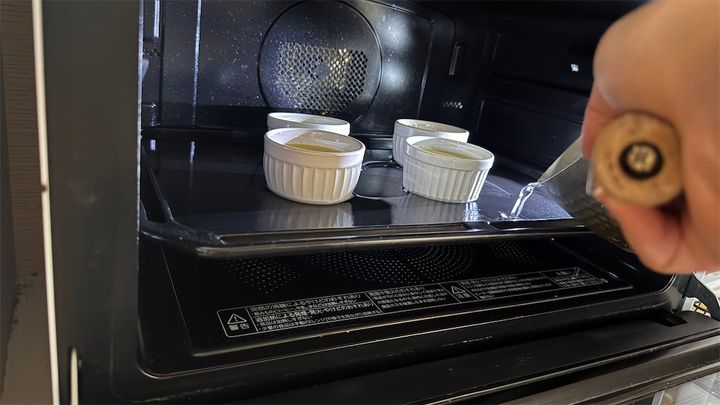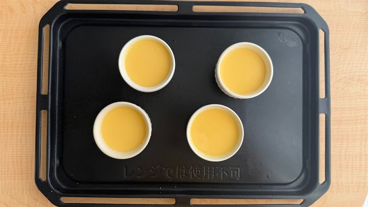 5. ゆらしてみて、表面に膜が張ってふるふるしていたら焼き上がり。冷蔵室で2時間以上しっかり冷やす。