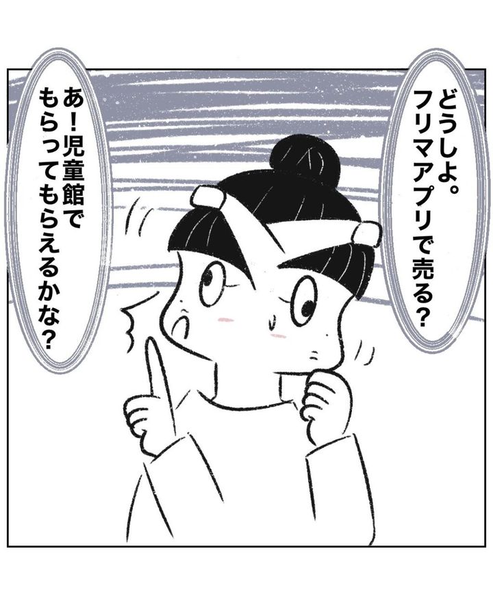 「どうしよ。フリマアプリで売る?あ!児童館でもらってもらえるかな?」考え込んだまるさんは、児童館でもらってもらうという案を思いつきました。