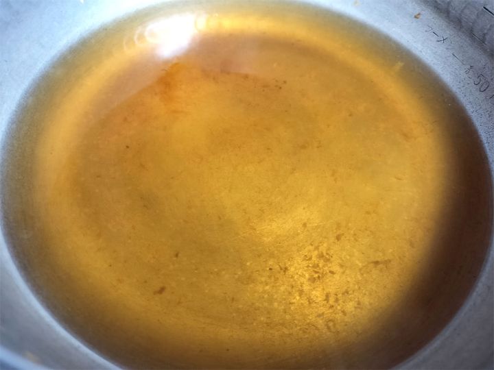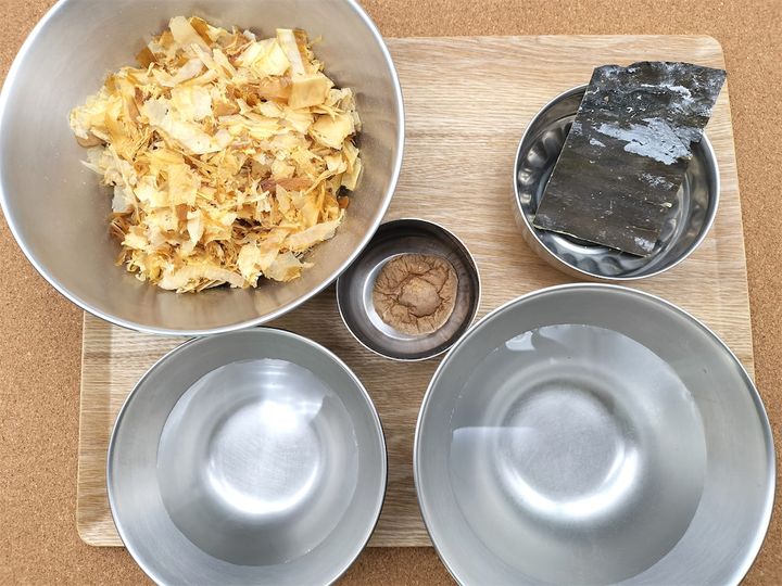 2. 1のだしを鍋に戻し、干ししいたけの戻し汁を加えます。味をみて薄く感じたら、かつおだしを加えます。