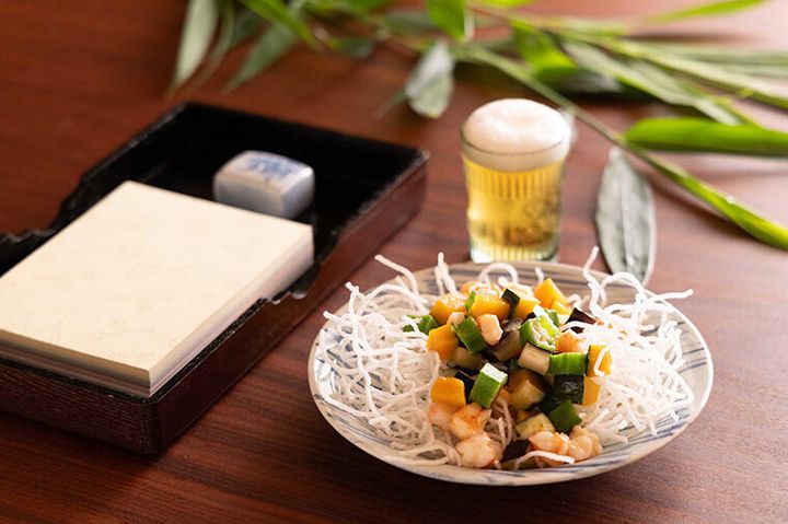 五節句の一つである七夕は、中国の牽牛と織女(しょくじょ)の物語にあやかり、機織りや裁縫の上達を願うお節句のこと。祈りとともに供えた五色の糸にちなんで、料理に素麺を使いますが、お酒のつまみになるようにちょっと趣向を変えて、春雨を揚げてみました。