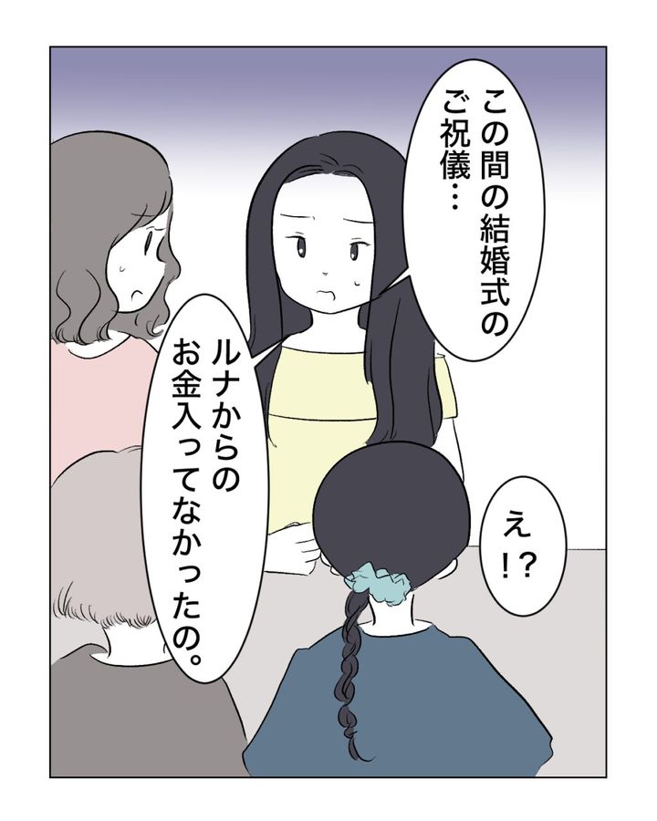 「この間の結婚式のご祝儀・・ルナからのお金入ってなかったの」アオイさんの言葉に、「え!?」そこにいた全員が驚いて言葉を失いました。