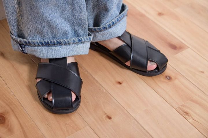 ほんのりボリューム感のあるサンダルで、足もとにほどよい存在感を。クロスした太めのベルトが足もとを大人っぽく演出してくれます。