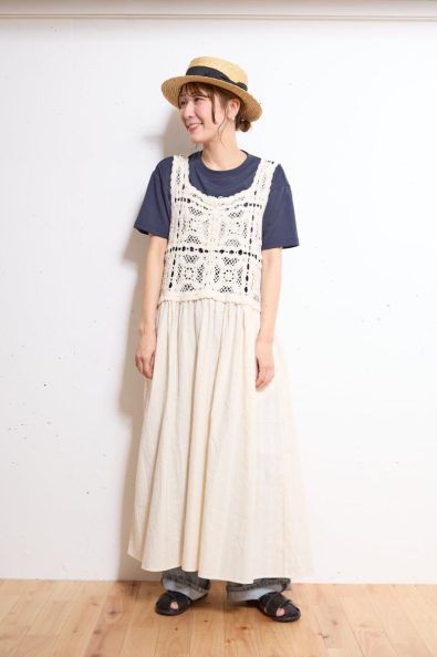 【スナップ】かぎ針編み風のワンピースを主役にした、夏のナチュラルレイヤード