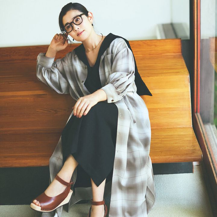 トレンドのセーラーカラーにシアーなチェックのワンピースを重ねて大人のマニッシュスタイルに。
