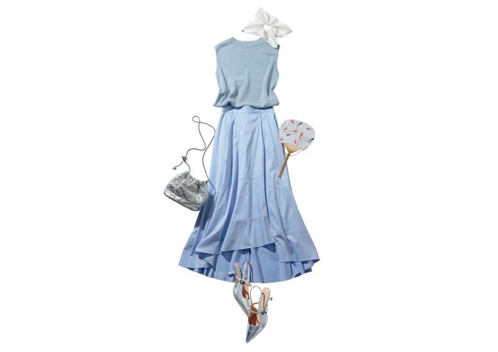夏気分が盛り上がるお祭りだからシルバーバッグ&サンダルでツヤめきを。さらにブルーのラメニットとフレアスカートで清涼感たっぷり。足さばきのいいアシンメトリーのスカートがシルエットをきれいに見せてくれます。