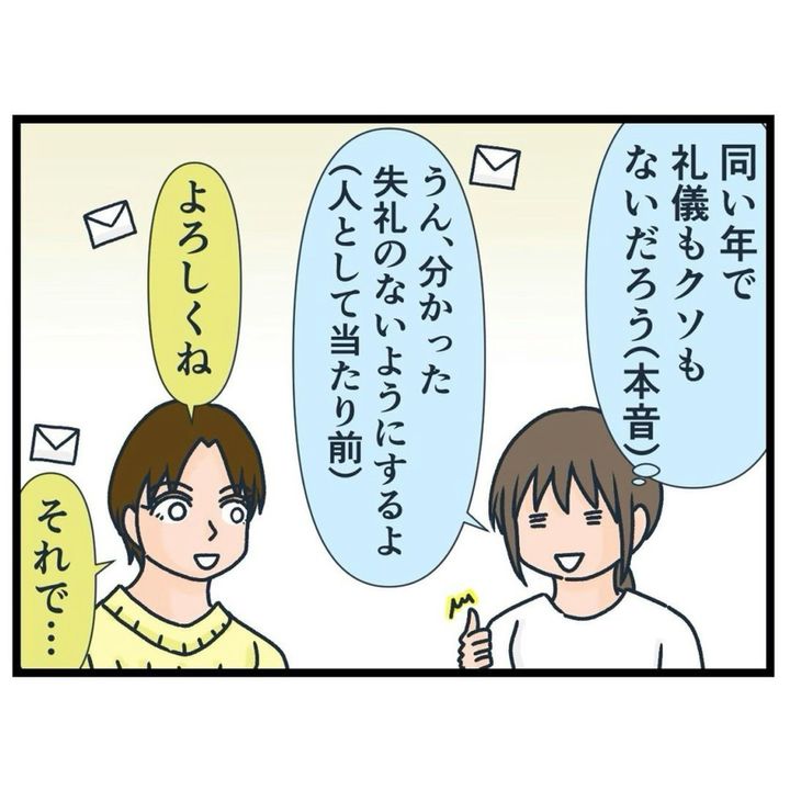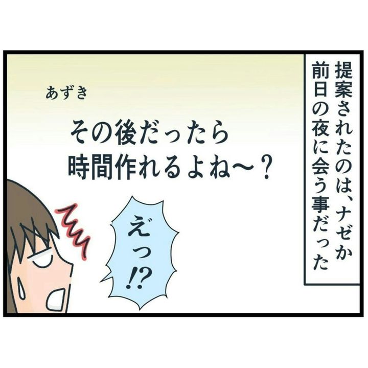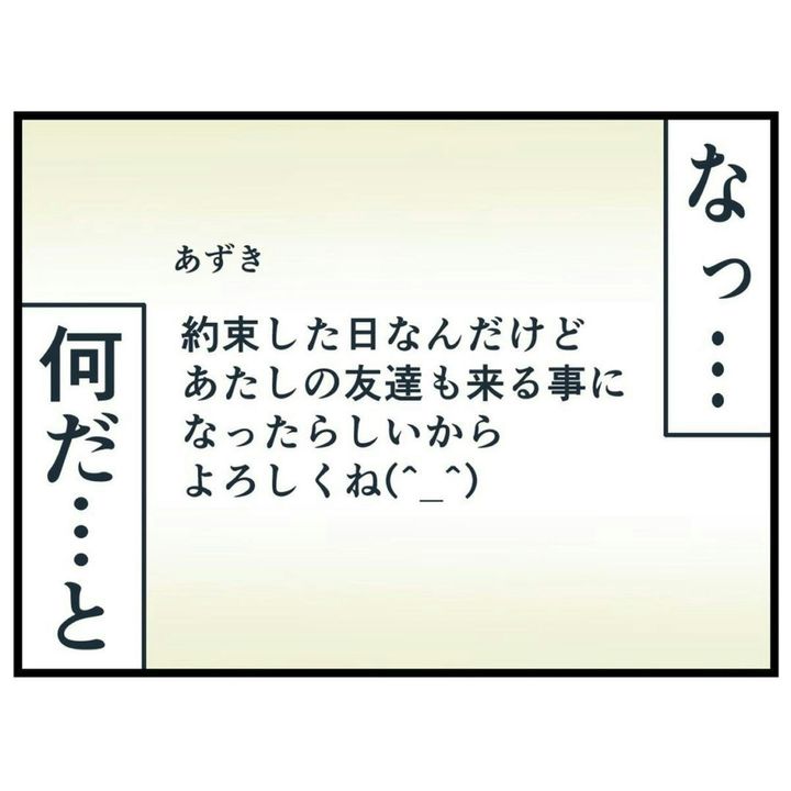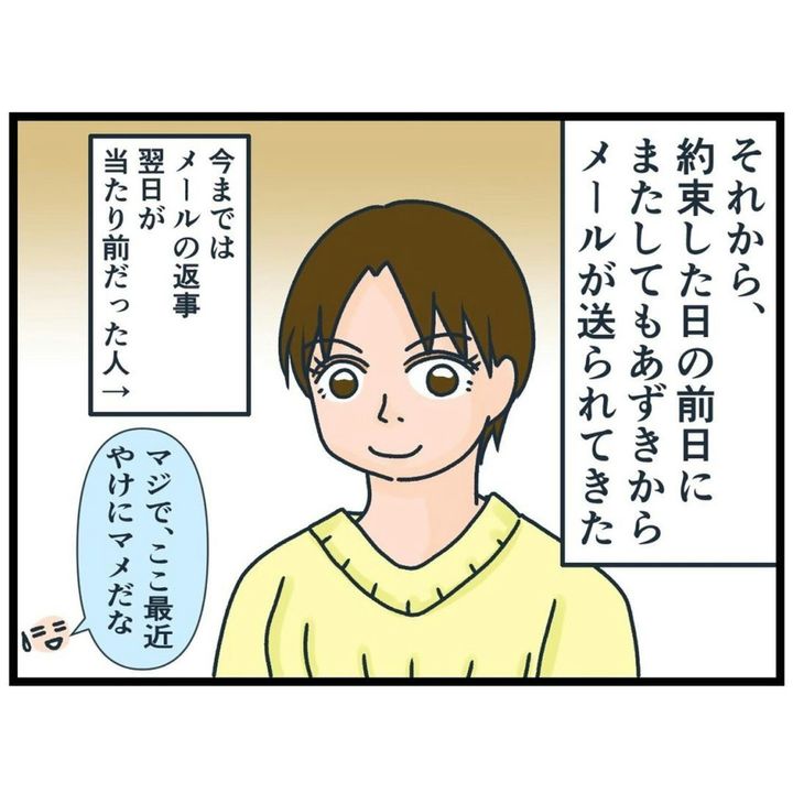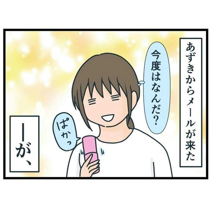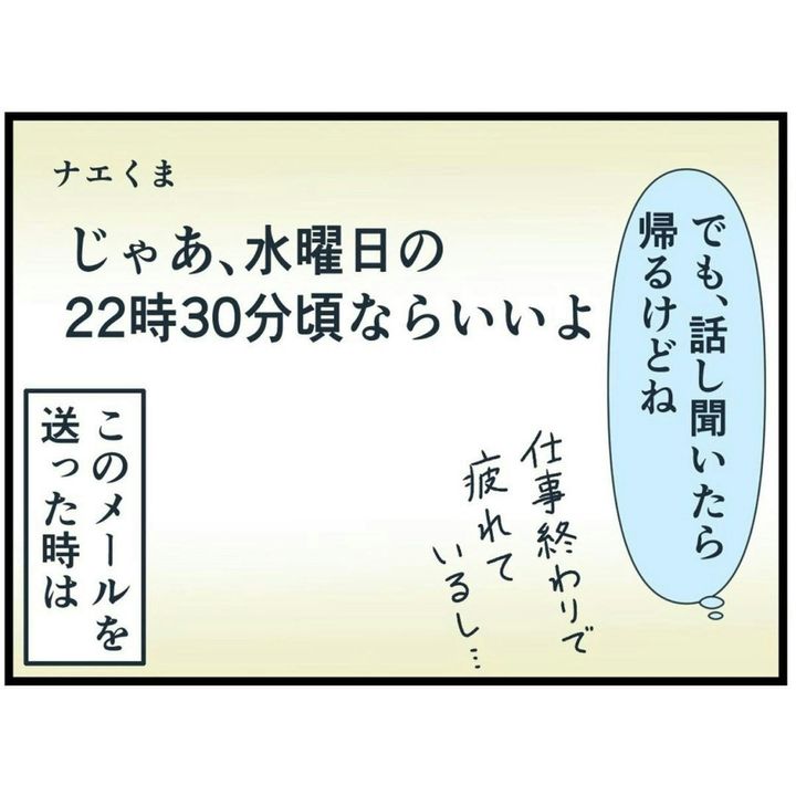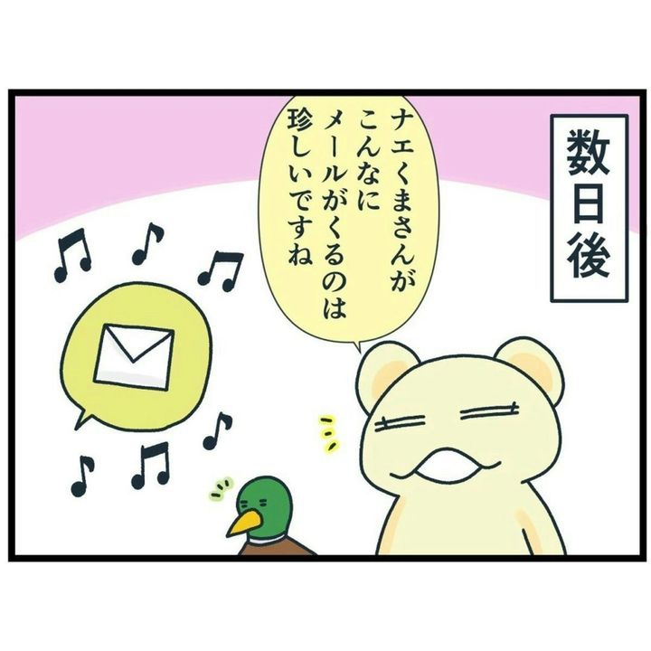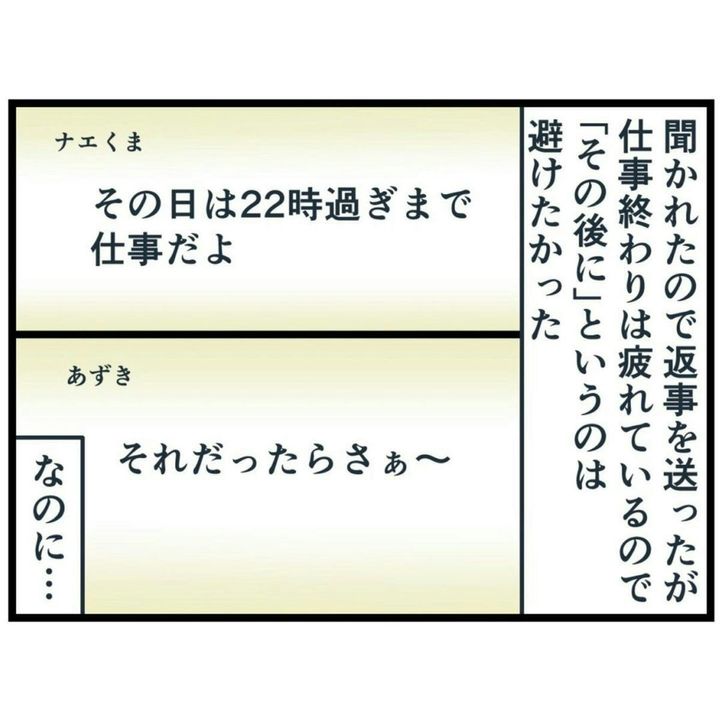 しかしあずきの話はどうも要領を得ない話が続きます。「バイトの調子がいい」とか「ナエくまさんにもこのバイトをやってほしい」など、ふんわりとした情報でナエくまさんと会う約束をしようとします。ナエくまさんはあずきからの誘いがうれしかったので、数日後に会う約束をしますが、その後もあずきからは不思議な内容のメールが届くようで…。