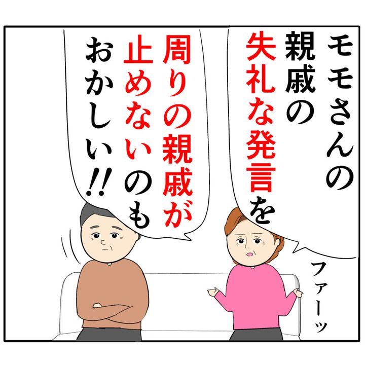 「モモさんの親戚の失礼な発言を周りの親戚が止めないのもおかしい!!」と三郎さんと同じくモモさんの親族を批判。横に座っている義父も無言で頷きます。
