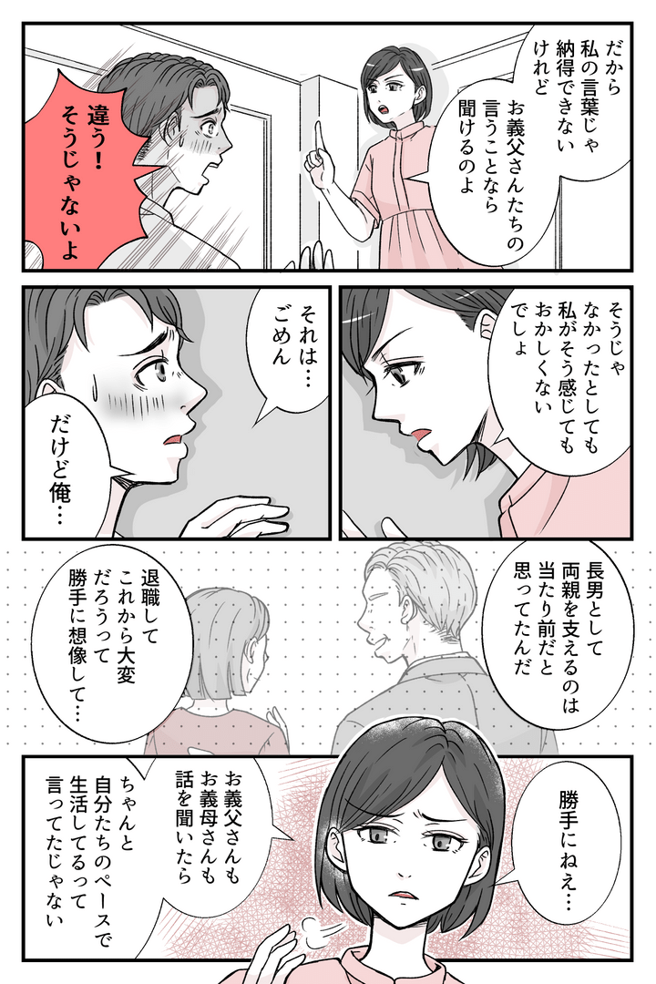 私の両親のことは他人事、お金が足りなければパートを増やせばいいと言う身勝手さ。謝られても、簡単に許せるものではありません。「長男の前に、夫として父親として責任を果たして」と突き放しました。