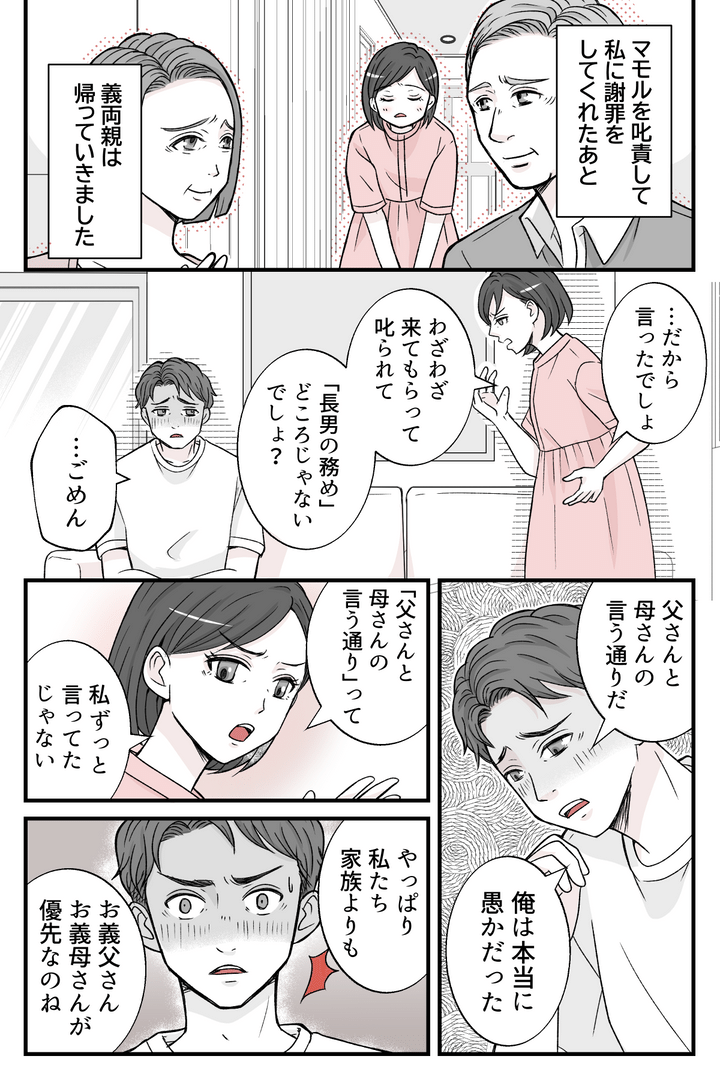 マモルを叱責して、私に謝罪をしてくれたあと、義両親は帰っていきました。義両親の帰宅後、私たちのあいだには重苦しい空気が流れていました。あまりにマモルが静かなので、仕方なく私のほうから声をかけます。マモルは自分の浅はかさを痛感しているようでした。