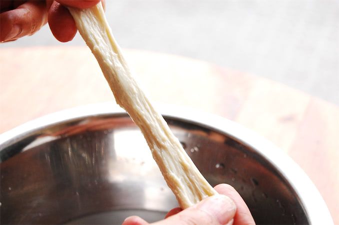 出来立て直後にも、グルテンを伸ばしてみたところ、こんなには伸びず、すぐ、プチンと切れてしまいました。