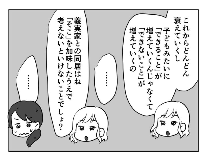 ミホさんがド正論すぎて、チナツさんは何も言い返せませんでした。そう、たしかにチナツさんは「小1の壁」「正社員復帰」「食事の支度」というメリットだけを考えて同居に踏み切りました。しかし当初はやる気だった義母だって、日々身体は衰えてしまうのです。やる気はあったものの、実際は最低限しかできない……。もちろん約束は守ってもらいたいところですが、老いには勝てないのも現実なのかもしれません。そして子どもの手は離れていくけれど、義両親は衰えの一途をたどるだけなのです。同居を考えるときに、そこまでしっかりとイメージしましたか? チナツさん?