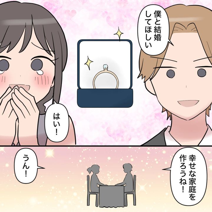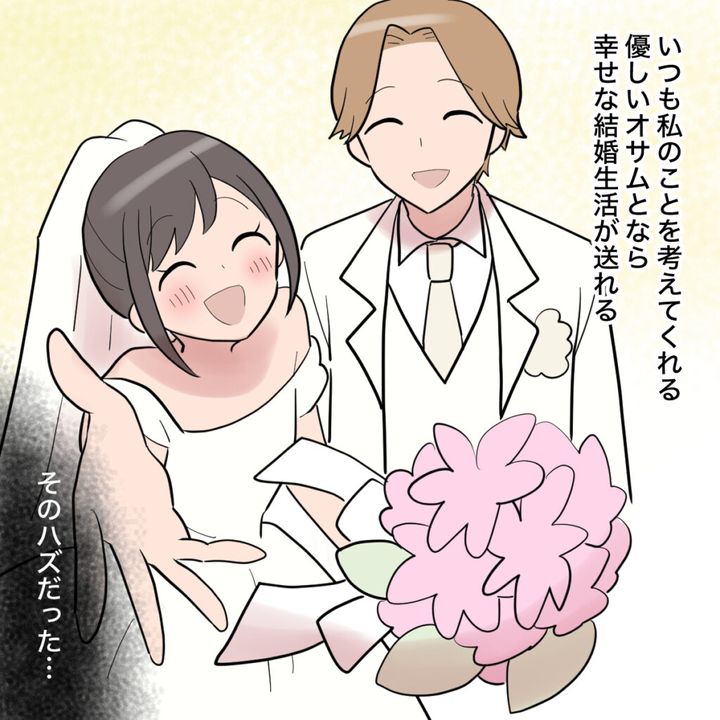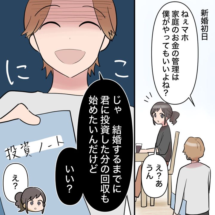 「マホ、はい」とオサムさんに花束を差し出され、ドキドキするマホさん。誕生日には予約の取れないレストランを前から予約してくれて、婚約指輪をプレゼントされてプロポーズ!「幸せな家庭を築こうね」と言われ、優しいオサムとなら幸せな結婚生活が送れる!そう期待していたのですが、新婚初日、家庭のお金の管理をかって出たオサムさんに、「結婚するまでに君に投資した分の回収も始めたい」と言われ、唖然とするマホさん。君に投資した分って・・??オサムさんの笑顔が怖いです!!