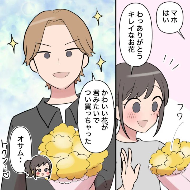 オサムと付き合いだしてからというもの、愛されてるって実感しちゃう私。「マホ、はい」そう言って差し出された花束!「わっありがとう!キレイなお花」私がそう言うと、「かわいい花が君みたいでつい買っちゃった」オサムにそう言われてトクン・・。普通の人が言ったら歯が浮くようなセリフだけど、とっても似合うオサム。私はオサムに夢中でした。
