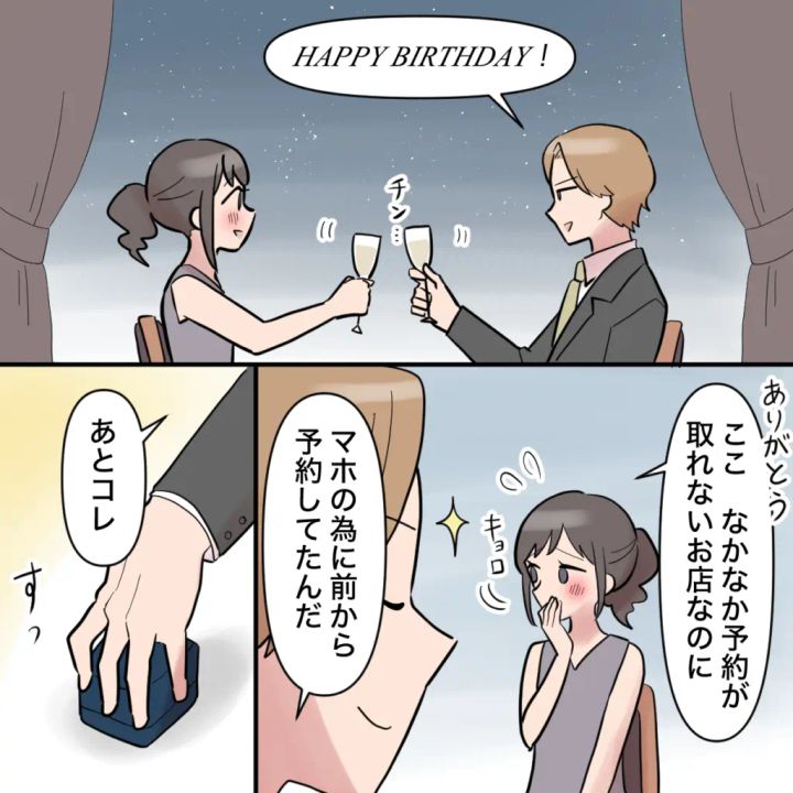「ありがとう。ここ、なかなか予約が取れないお店なのに」つい辺りを見回してしまう私に、「マホの為に前から予約してたんだ」そう言った後、「あとコレ」と差し出されたのは、