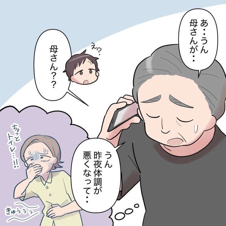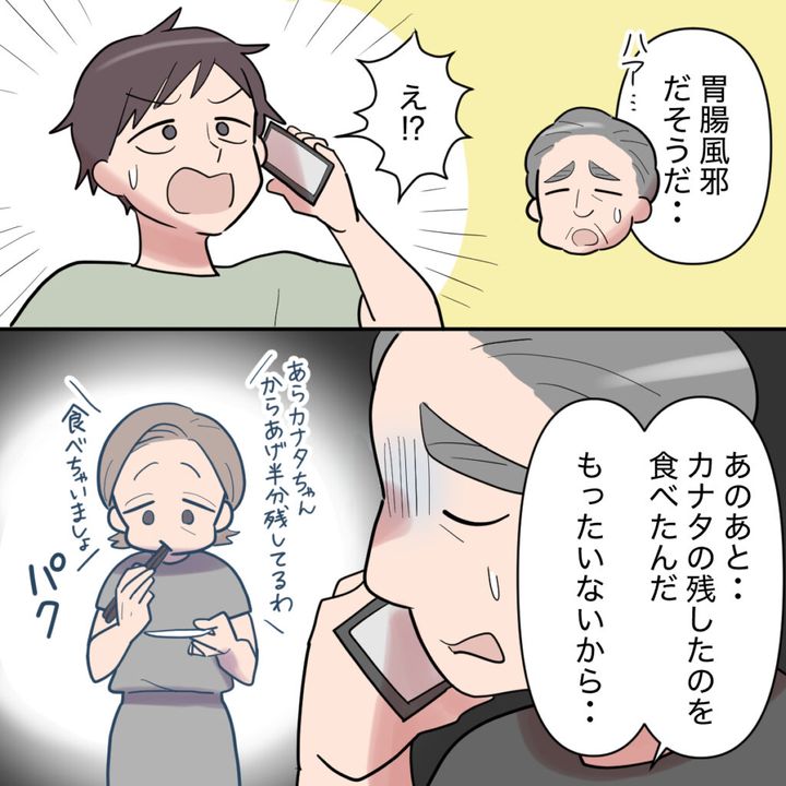 次の日の夜、心配して電話をくれた義父と話すゆうさん。カナタくんは胃腸風邪だと話すと、なんと義母も昨夜体調を崩して胃腸風邪だと・・!!どうやらカナタくんが残したものを食べたらしく、それを聞いたゆうさんは絶句!お互い体調には気をつけてと言い合う親子。「もったいないから」と食べてしまう義母の気持ち、ちょっぴりわかる気もしますが、これは絶対食べちゃダメでしたね。
