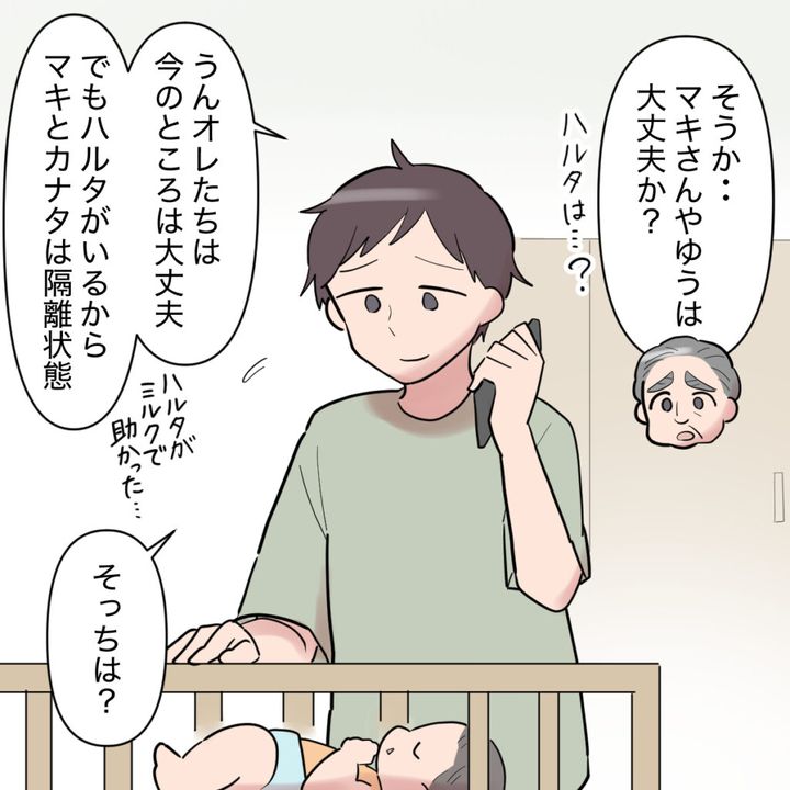 「そうか・・マキさんやゆうは大丈夫か?ハルタは・・?」と心配する義父に、「うん。オレたちは今のところは大丈夫。でもハルタがいるから、マキとカナタは隔離状態。ハルタがミルクで助かったよ・・。そっちは?」と逆に心配するゆう。