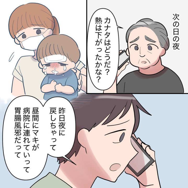「カナタはどうだ?熱は下がったかな?」義父からの電話にゆうが、「昨日夜に戻しちゃって、昼間にマキが病院に連れて行って、胃腸風邪だって」と伝えると、