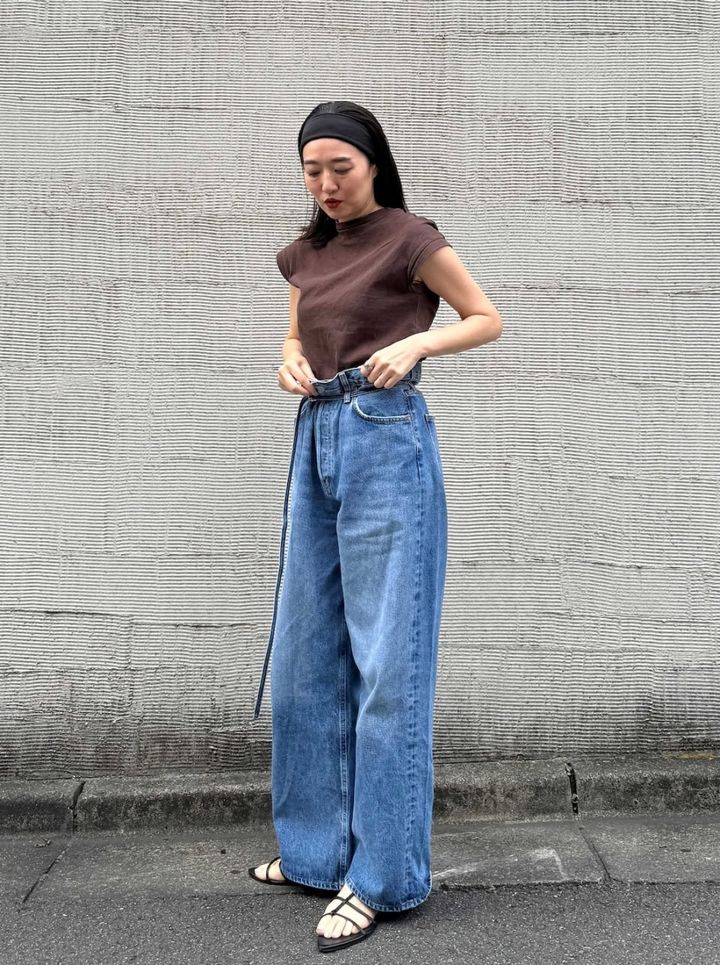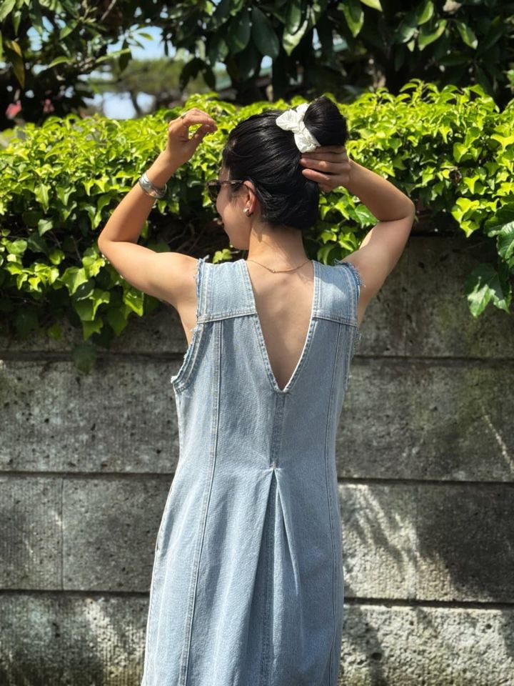 この夏の制服になりそうな、タンクトップ×デニムの超カジュアルスタイルに、少しエッジがほしいときにも真知子巻きが大活躍! 簡単に取り入れられて、マンネリコーデの打開策としても優秀です。