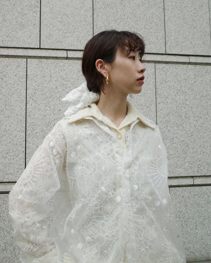 夏のロングヘアを涼しげに見せてくれるヘアバンド。大ぶりなフープピアスがしっかりと見えるようになり、顔まわりを華やかに演出してくれます。女性らしいレースとのバランスが◎。