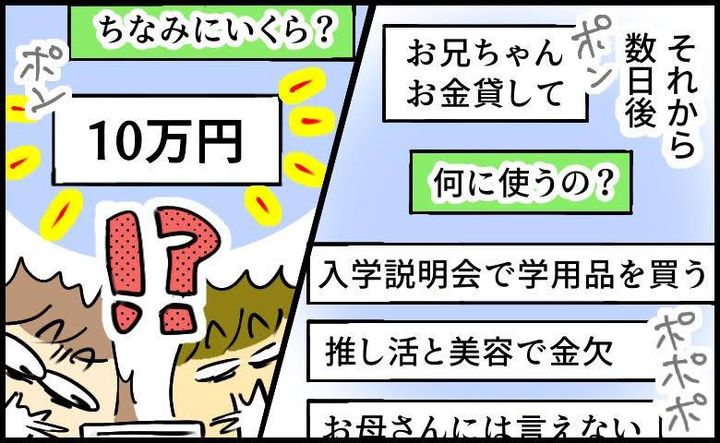 それから数日後、義妹から今度は「お兄ちゃん、お金貸して」とLINEが。「うわ、妹がお金貸してだって」と夫は友人に報告後、とりあえず理由を聞くことに。返信には「入学説明会で学用品を買うんだけど、推し活とか美容に使いすぎちゃった。お母さんには言えないからお願い」とあり、夫もさすがにあきれるばかり。