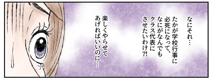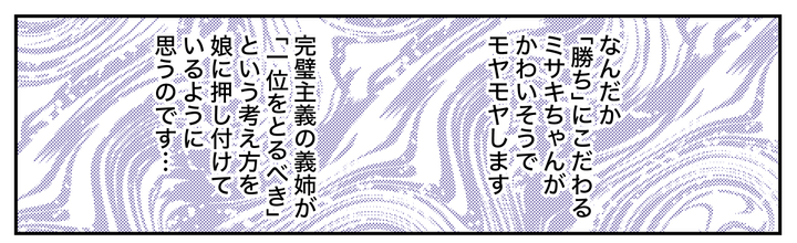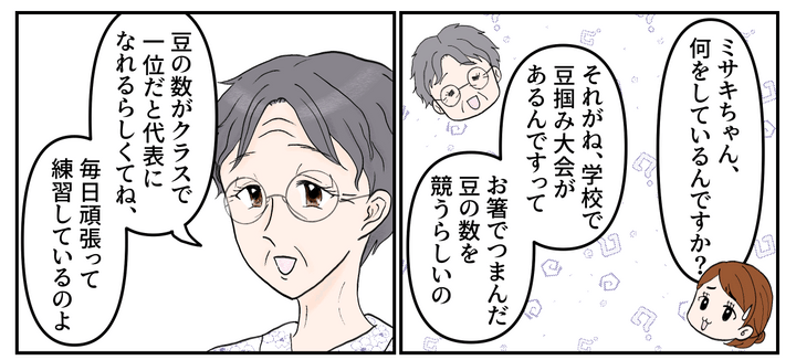 習い事が多いだけならまだしも、たかが学校行事の豆掴み大会のために必死で練習させられているミサキちゃん。楽しく参加できればいい行事なのに、なぜここまで一番にこだわらなくちゃいけないのでしょう。何がなんでも代表にさせようとする義姉の方針には、正直ついていけません。
