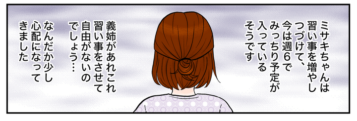 私はナツ。夫のアラタと小学5年生の娘ハルと暮らしています。子どものうちはのびのび遊んで育ってほしいと思い、ハルにはこれまで習い事もさせてきませんでした。一方で義実家で同居している義姉夫婦の娘ミサキちゃんは毎日習い事に大忙し。今までやってきた習い事はスイミング、ピアノ、書道、そろばん、英会話。そして最近では塾通いまで! あらゆる分野で一番を目指すべきだという義姉の教育方針に、私はモヤモヤしていたのでした。