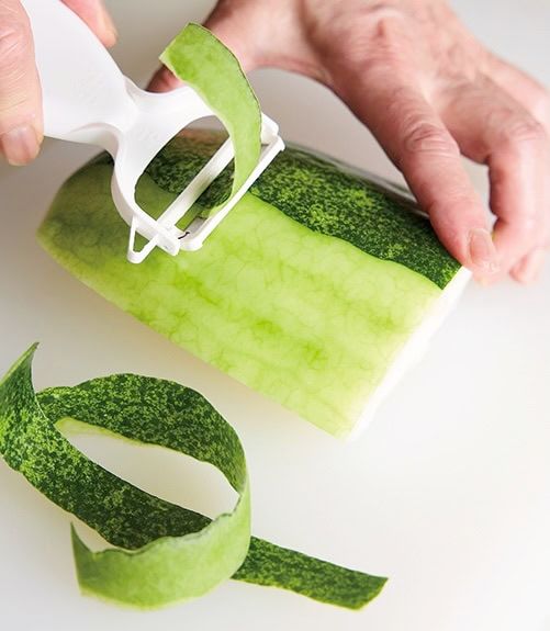 POINT_冬瓜の皮は、ピーラーを使ってむいて! 皮が薄くむけて鮮やかな色みになり、ワンランク上のでき栄えに。