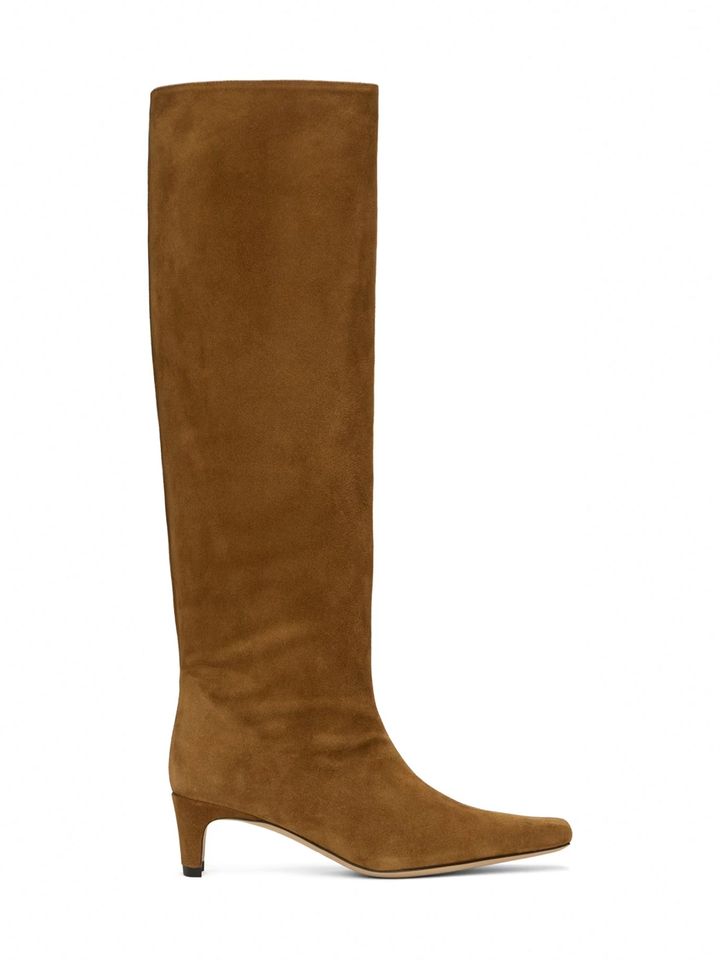 グラマラスに攻めたい日には、エミリー・ラタコウスキーが愛用するハイヒールのポインテッドトウブーツを。キャメルスエードと膝下まで伸びるシャープなフォルムが、コーディネートを洗練されたムードへと引き上げてくれる。