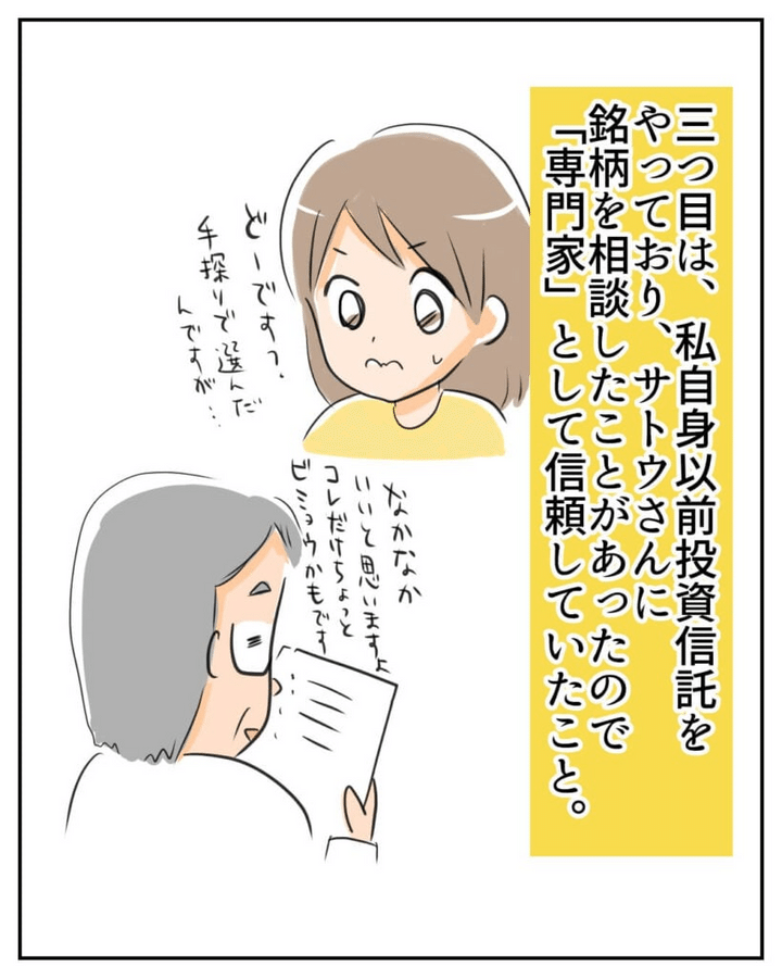 サトウさんは、腰の低い初老の男性。しっかりした保険会社に勤めていることや、資産運用の相談をしてアドバイスをもらっていたこともあり、信頼していました。
