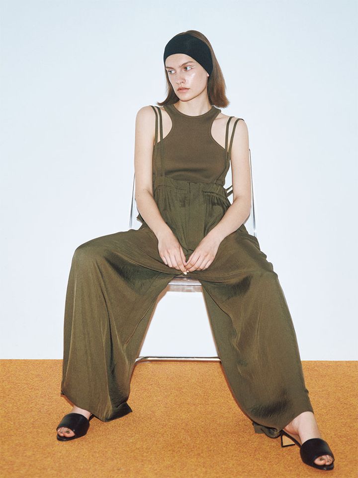光沢素材にワッシャー加工をほどこした、クールになりすぎないカーキのサロペット。ツヤめくパンツに付属するダブルストラップを肩にかけたひと手間で、ヌーディな印象をいっそうきわ立たせて。腰位置を上に引き上げ、脚線もあらわにならないスタイルアップフォルム。