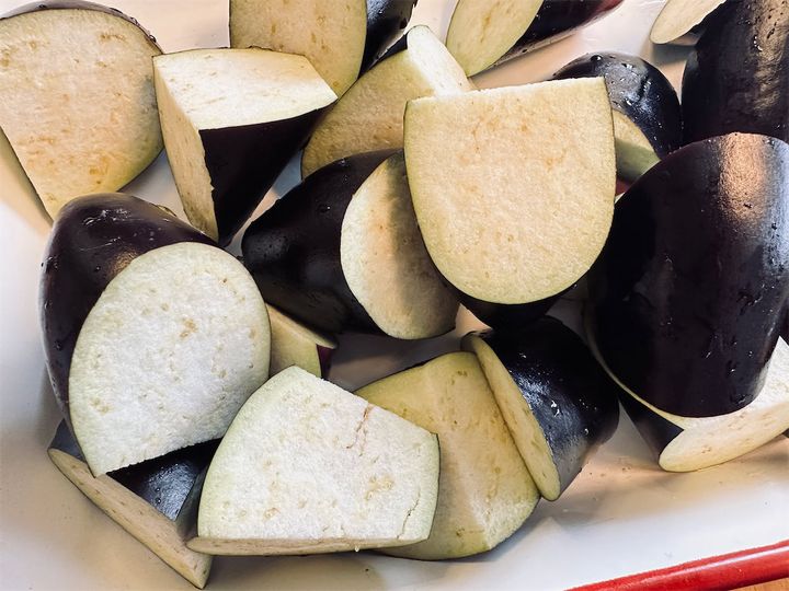2. 鍋にこめ油を入れて、なすを軽く炒めます。